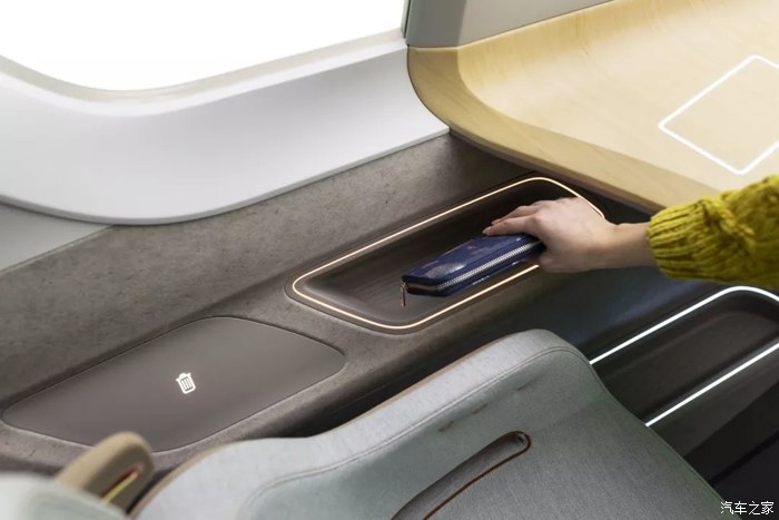 智能内饰表面(SIS)桌板:桌面可实现温度与音量调节、启动UV清洁功能及导航系统。当桌面未被激活时,表面呈现天然优雅的木质表面装饰效果。
