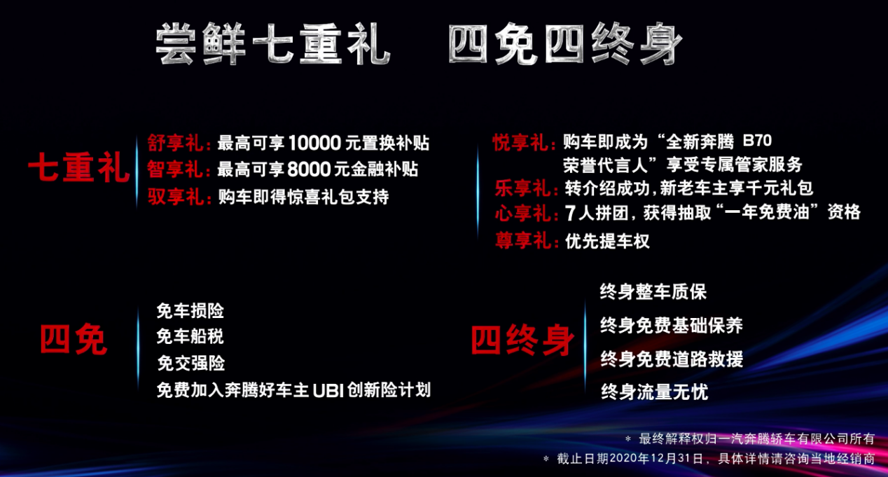 “无限方程FMA架构”下诞生的全新第三代奔腾B70,可以说是“吊打”了市面上大部分家轿产品,无论是吸睛的颜值、宽大的空间还是丰富的智能科技。而9.99-13.99万元的售价,只是合资入门紧凑型家轿的价格,便能享受更有价值感和获得感的用车体验,加上“尝鲜七重礼,四免四终身”的购车政策,一次购车,终身无忧。