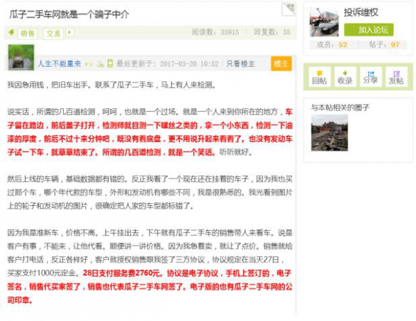 一位网名为“人生不能重来”的网友在某论坛的投诉维权板块曝光了瓜子二手车的“耍流氓”行为。据悉,该网友在瓜子二手车出售了一辆旧车,并很快就有买家表达购买意愿。但就在过户前夕,买家突然变卦,交易只好终止。此时,销售人员表示已经联系了一个车贩子接手,要求该网友配合取消原来的合同。 (图5)