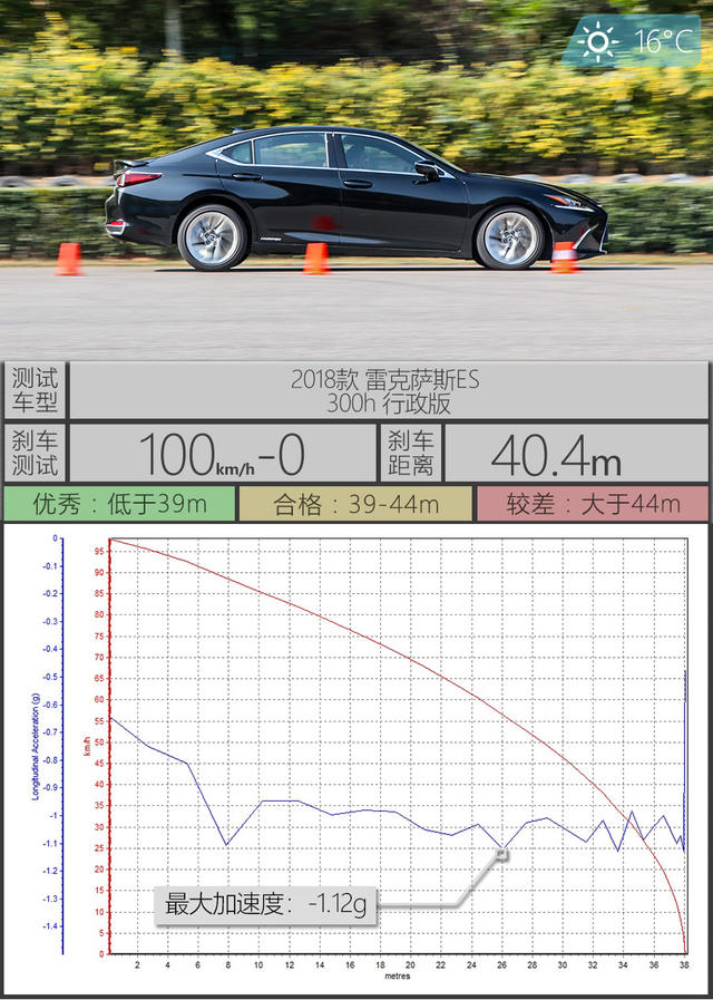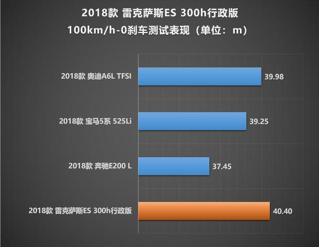 虽然ES 300h的刹车脚感较好,但刹车成绩与同级别相比没太大优势。另外,在我们的测试中,它的极限刹车力不是很足,多次测试后容易出现刹车热衰减的情况。