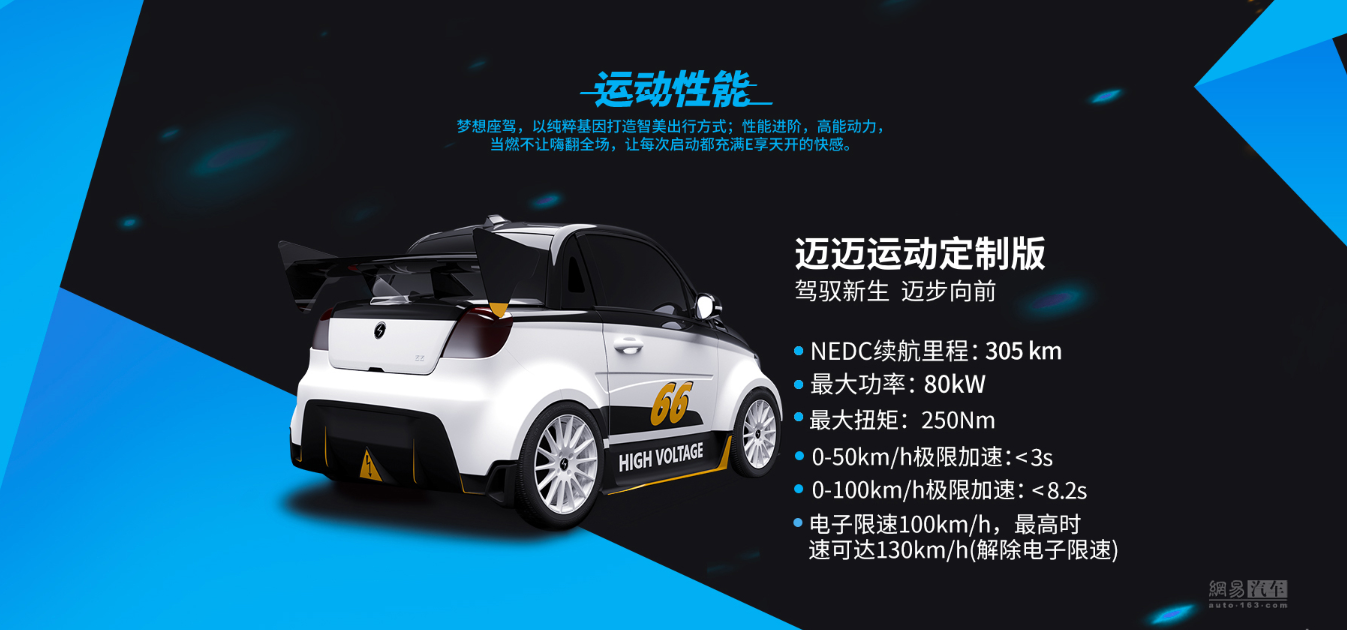 2.加速续航:NEDC续航305km,最大功率80kW,最大扭矩250N·m,0-50km/h加速小于3秒,0-100km/h加速小于8.2秒,电子限速100km/h(最高时速130km/h)