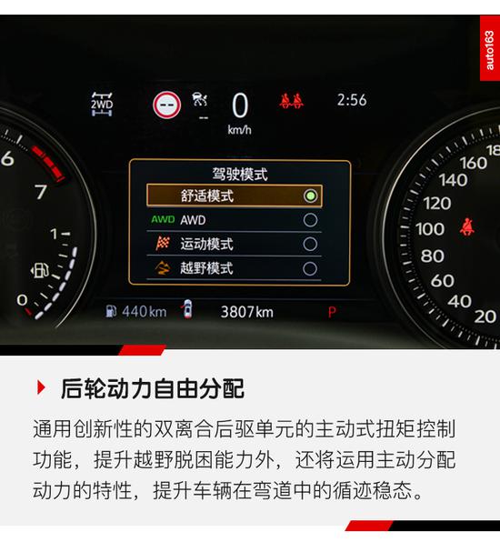 Disconnect可分离分动器在路况良好的情况下,可断开后轴链接,物理隔绝多余的动力损耗,为凯迪拉克SUV车型带来媲美两驱车的油耗水平。在需要作出快速响应时,Disconnect可分离分动器能够在极短时间内将动力分配给后轮。Twin-clutch双离合后驱单元的主动式扭矩控制功能,能以每秒高达上百次的频率,在0-100%的范围内,动态分配左右轮间的扭矩,提升了驾驶的灵活性和稳定性。配合舒适/AWD/运动/越野驾驶模式的切换,更能从容应对各种路况环境。