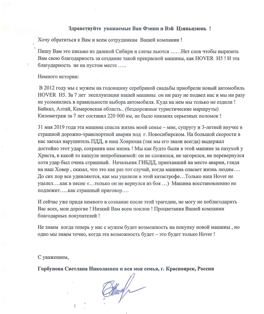 近日,在长城汽车图拉州工厂投产一周年之际,长城汽车董事长魏建军、总裁王凤英,收到了一封发自俄罗斯西伯利亚红色亚尔斯克市的特殊来信。来信者名叫戈尔布诺娃•斯维特兰娜•尼古拉耶夫那。信件以全家人的名义,感谢哈弗的救命之恩。